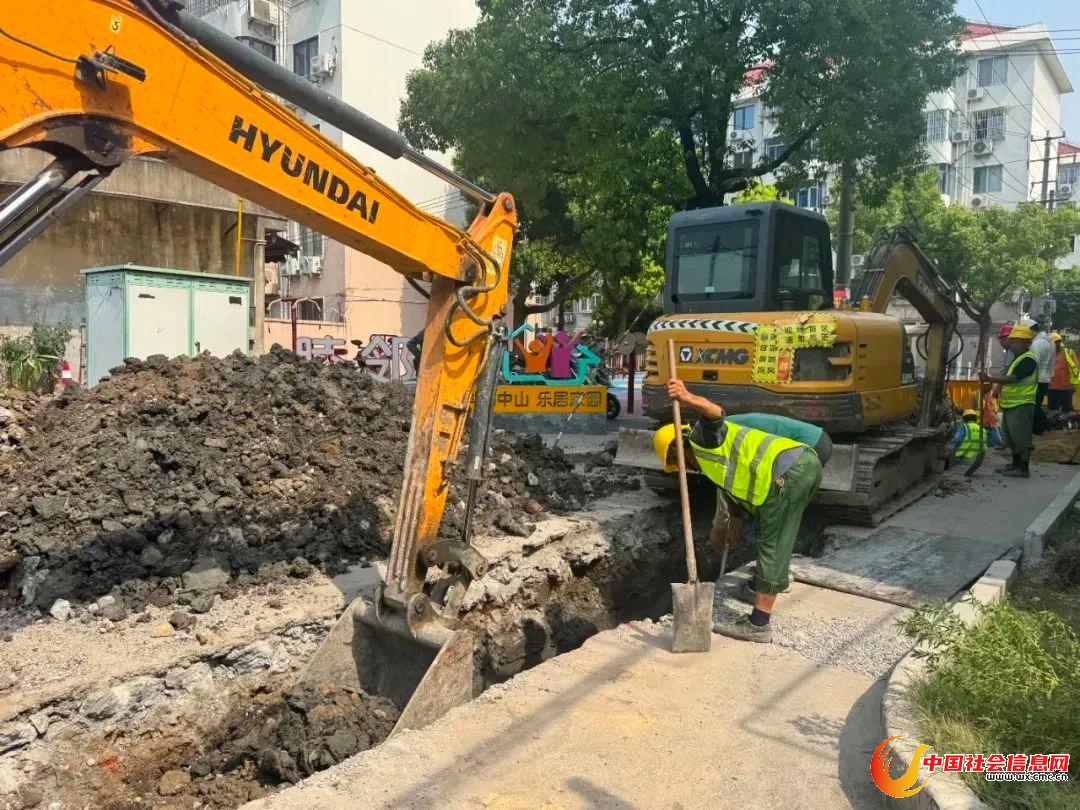 松江区天虹二村改造现场机械轰鸣,施工人员操作挖掘机破开路面,有序进行沟槽开挖、管道铺设和热熔连接作业。“该点位工程已近尾声,预计本月末完工,”松江自来水有限公司施工管理负责人沈忱介绍道。