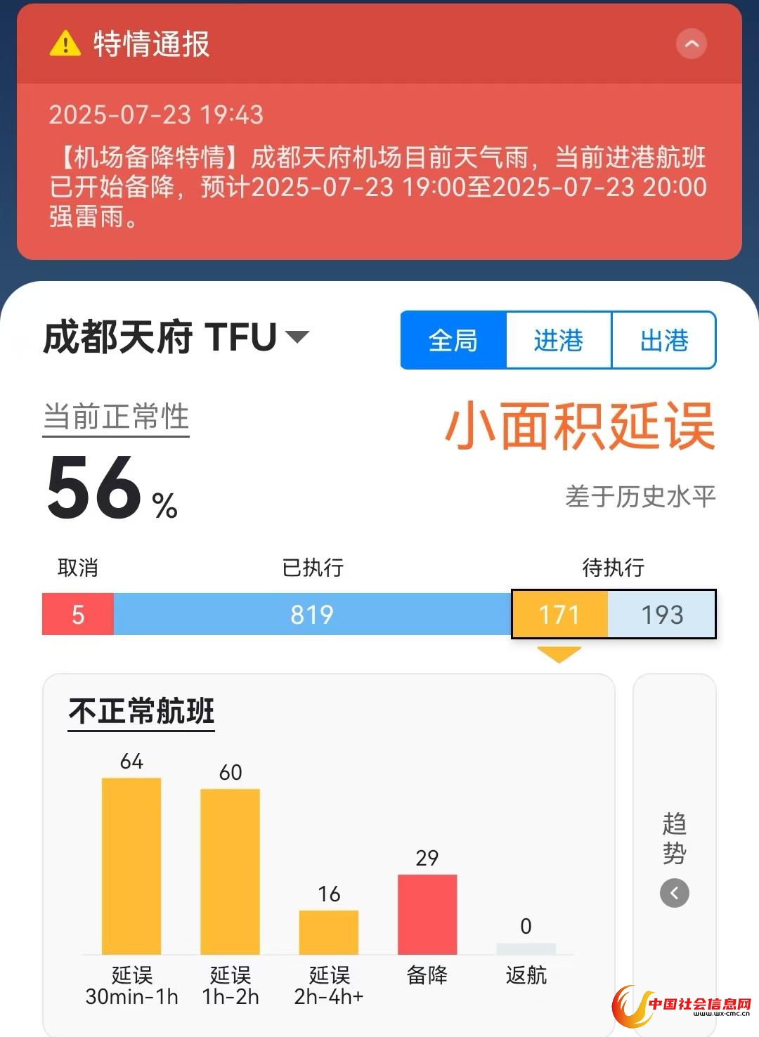 记者同时查询飞常准了解到,成都天府国际机场的进出港航班正常率仅为56%,截至当天晚7时45分,该机场已有29个进港航班出现备降情况,备降地点包括重庆、绵阳、贵阳、宜宾、成都双流国际机场等。此外,天府机场已有约140个进出港航班延误30分钟以上,其中延误超2小时的航班有16个。而成都双流国际机场暂无进港航班备降,延误30分钟以上航班约为50个。