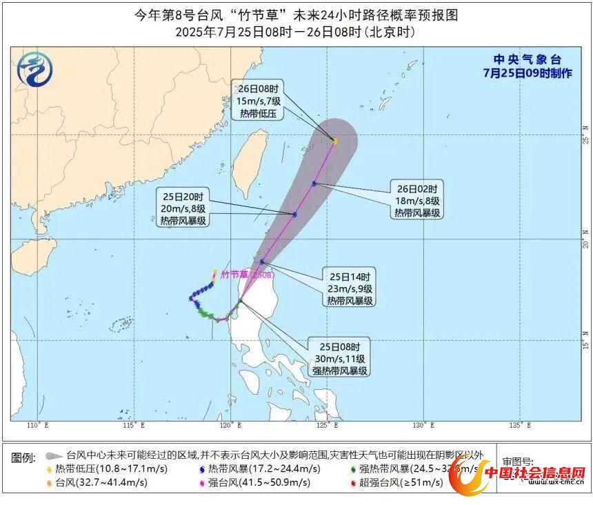 大风预报:7月25日08时至26日08时,受“范斯高”和“竹节草”的共同影响,东海大部、台湾海峡、台湾以东洋面、巴士海峡、南海东部和南部、杭州湾、江苏南部沿海、浙江沿海、福建沿海、台湾岛沿海将有6~8级、阵风9~10级大风。