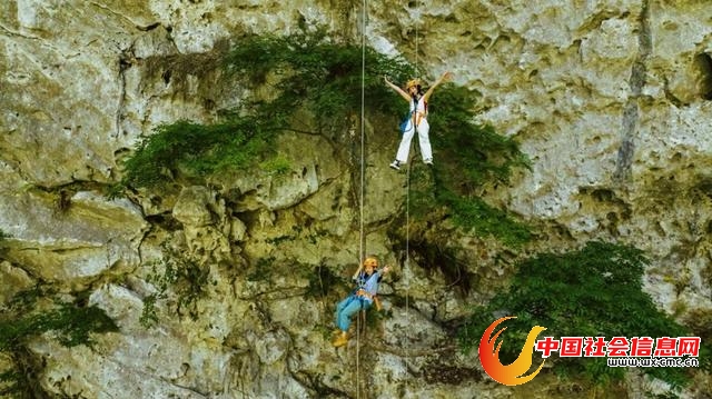 游客在风子荡天坑体验速降。乐业县文化体育广电和旅游局供图