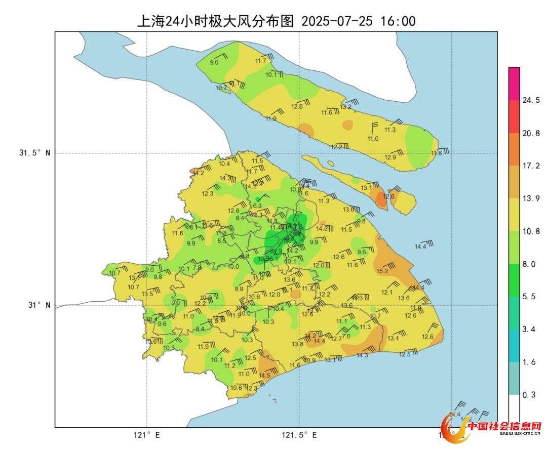 今天上海又是太阳、阵雨随机切换,全市最高气温在31-33℃之间,市区徐家汇站32.8℃,为全市最高。受台风“范斯高”外围影响,白天风力较大。截至16时,全市近半数地区出现6级以上阵风,其中闵行吴泾镇最大阵风达8级。