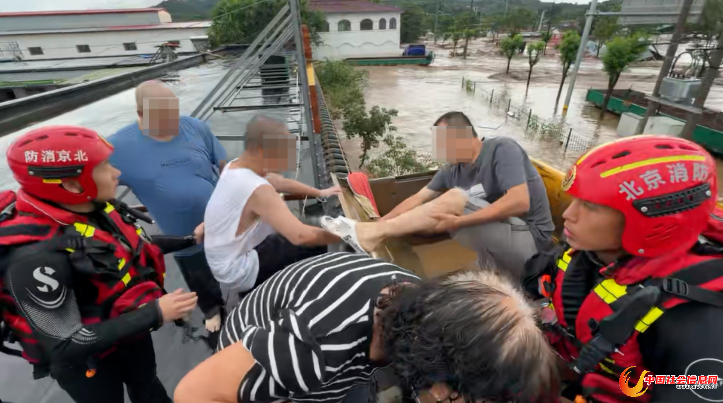 不过,也有一部分居民并没有来得及撤离,曾一度被上涨的洪水围困。7月28日上午,北京市密云区消防救援支队从密云区太师屯镇一处饭店的屋顶,用铲车解救了8名被困群众。