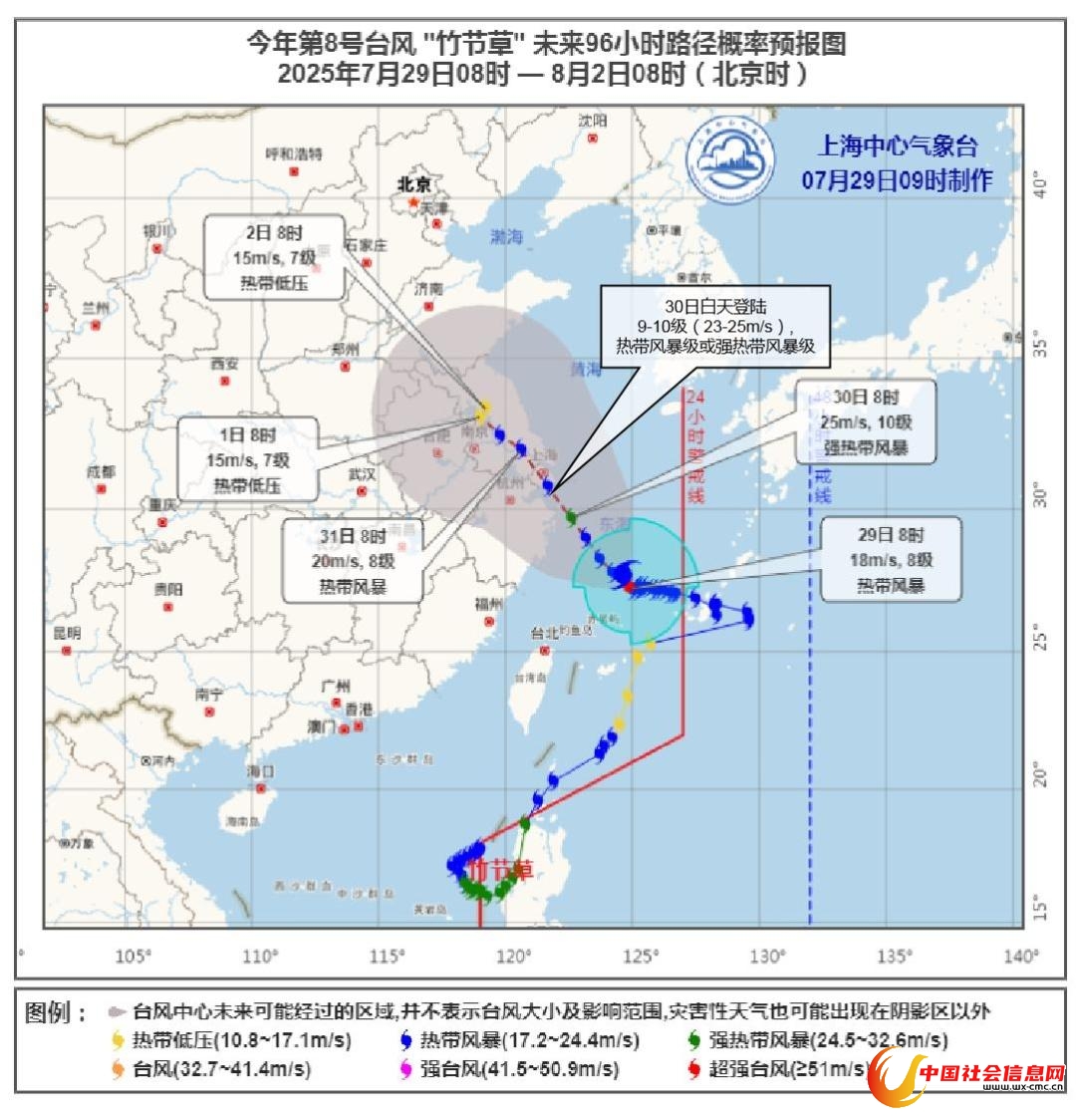 “竹节草”目前移动缓慢,尚未完全脱离季风槽,其登陆时间和登陆位置尚存在不确定性。“竹节草”也可能擦过舟山群岛在上海近海北上(概率约15%—20%),在此路径下对我区的风雨影响更弱一些,影响时间也会缩短。