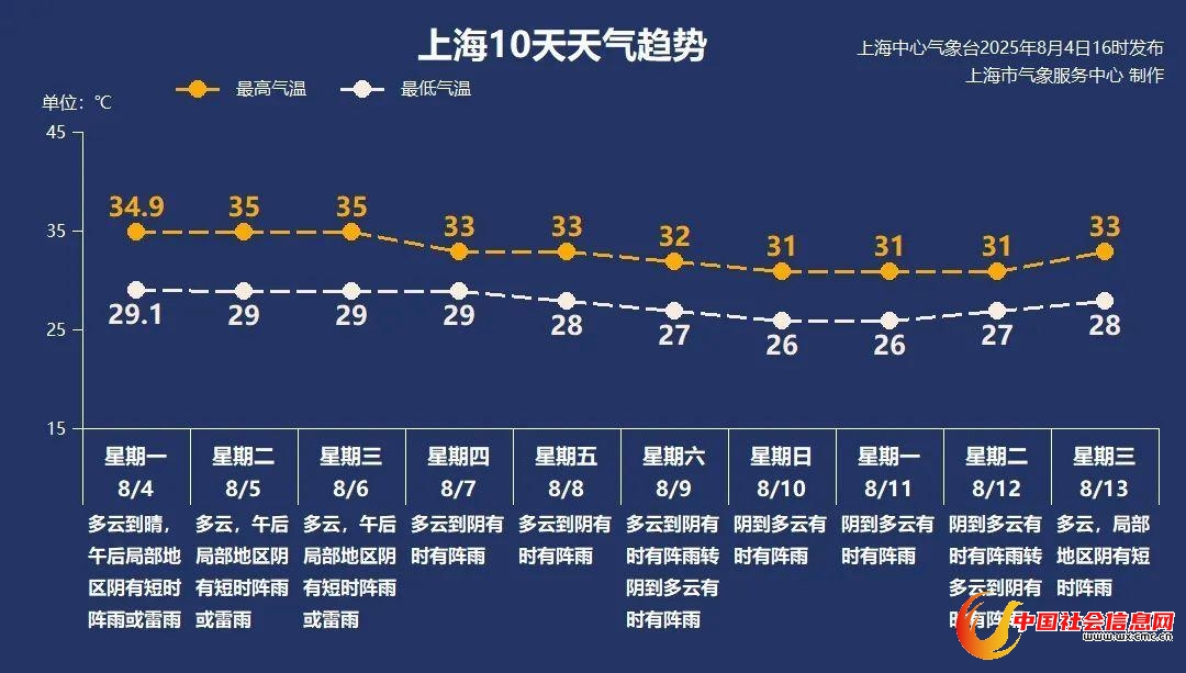 一直到本周中,最高气温仍将超过高温线,除了防暑防晒,午后继续防范雨水突袭,雷雨范围不大。周后期副热带高压的位置发生变化,上海主要处在它的边缘,云量增多,热度缓解,最高气温在32℃上下徘徊。同时阴雨天气也有所增多,降水范围扩大。请大家多多关注临近预报信息,做好防范。