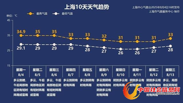 一直到本周中,最高气温仍将超过高温线,除了防暑防晒,午后继续防范雨水突袭,雷雨范围不大。周后期副热带高压的位置发生变化,上海主要处在它的边缘,云量增多,热度缓解,最高气温在32℃上下徘徊。同时阴雨天气也有所增多,降水范围扩大。请大家多多关注临近预报信息,做好防范。