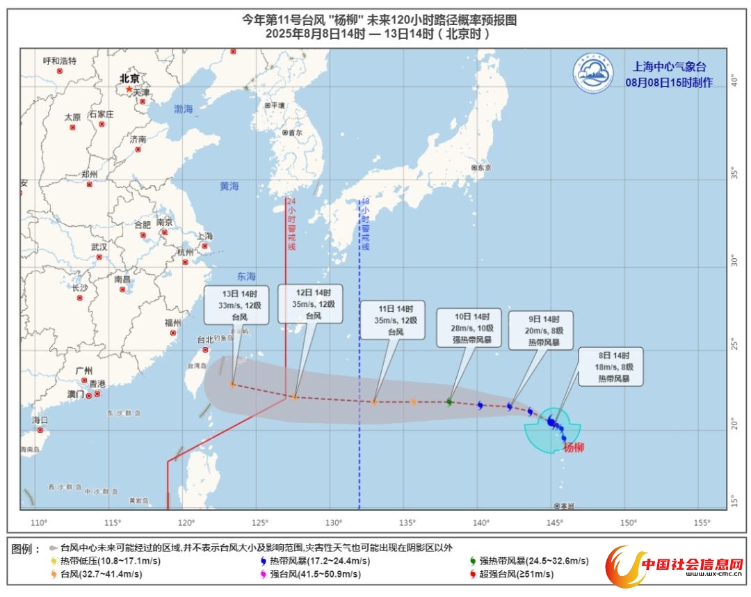 今年第11号台风“杨柳”(热带风暴级;英文名称:podul)于今天早晨在西北太平洋洋面上生成,下午14时位于台湾省花莲市偏东方向约2460公里的洋面上。预计,“杨柳”将以每小时15—20公里的速度向西偏北方向移动,强度变化不大,并向台湾以东洋面靠近。12日之前对本区无影响。