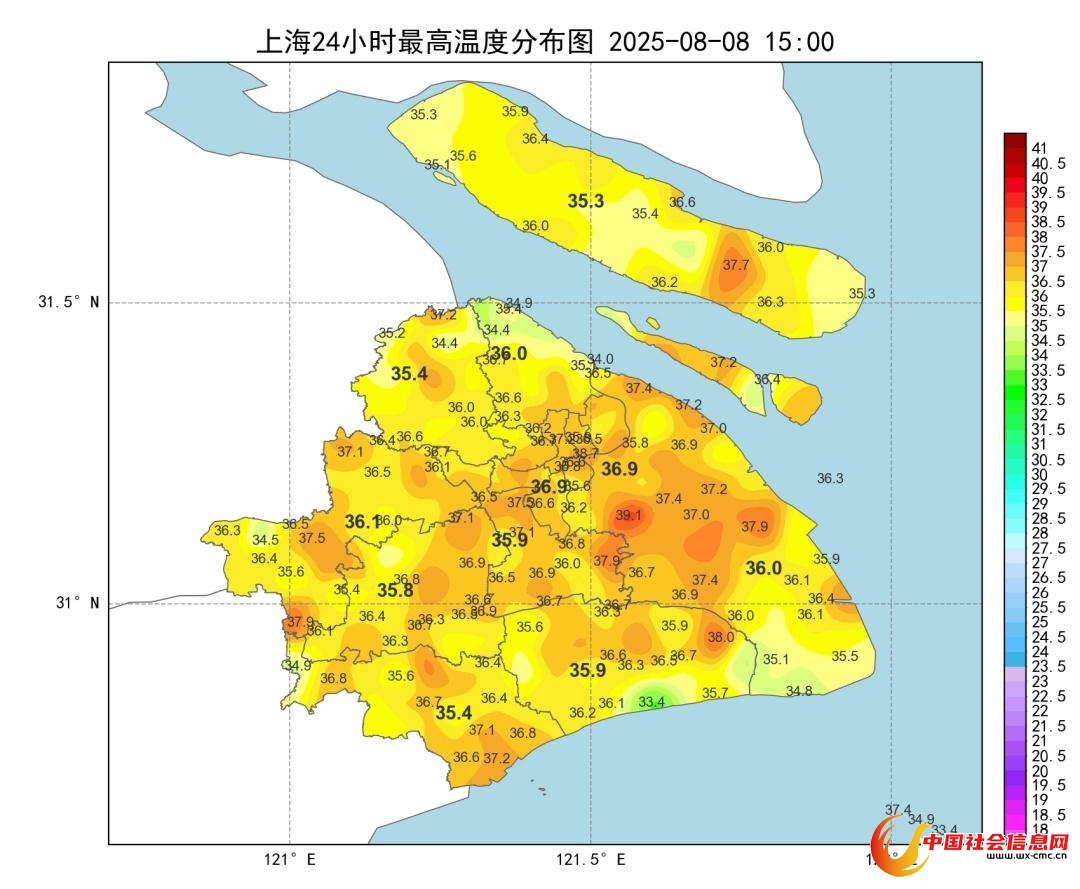 受副热带高压影响,本区今天(8月8日)全部街镇出现高温天气,闵行国家基本气象站最高温度为35.9℃,为今年第20个高温日。上海今天是多云为主的天气,早间全市最低气温在27—31℃之间。白天西南风助力气温快速上升,今天徐家汇站最高气温最终定格在了36.9℃,是近期气温的一个小高峰。由于气温高,午后崇明等地有局地对流云团发展,出现了短时雷阵雨天气。