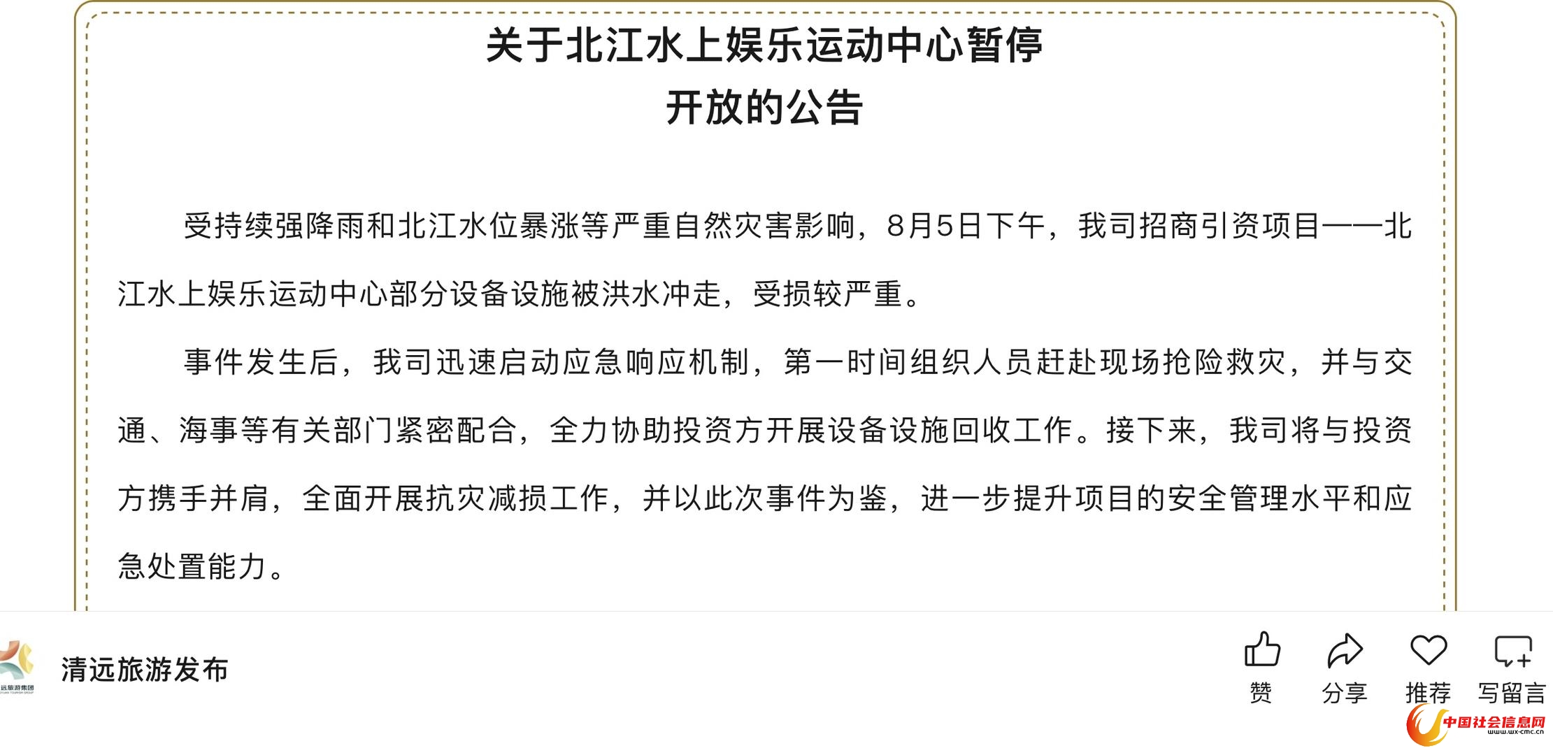 红星新闻记者了解到,事发后,清远市旅游投资集团有限公司发布了《关于北江水上娱乐运动中心暂停开放的公告》。公告称,受持续强降雨和北江水位暴涨等严重自然灾害影响,8月5日下午,公司招商引资项目——北江水上娱乐运动中心部分设备设施被洪水冲走,受损较严重。