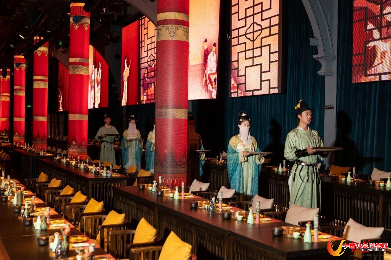 东郊记忆园区内,新业态“蜀宴赋”成为今夏最大亮点。这种沉浸式古风宴席,让游客在用餐中体验古代分餐礼仪,现场融合传统礼乐典仪与蜀地饮食美学。从先秦祭礼中的《鹿鸣》宴饮盛景,到汉代宫廷内《踏鼓优》鼓乐齐鸣,再到唐代丝路幻境里《丝路魅影》舞者婀娜,历史韵味跃然席间。