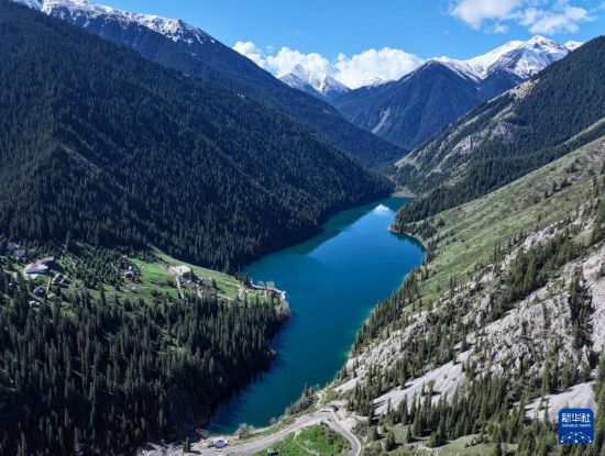 这是5月3日在哈萨克斯坦阿拉木图州拍摄的科尔赛湖国家公园风光(无人机照片)。