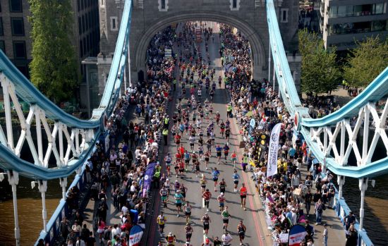4月27日,选手们从伦敦塔桥上跑过。当日,2025伦敦马拉松赛举行。新华社记者 李颖 摄