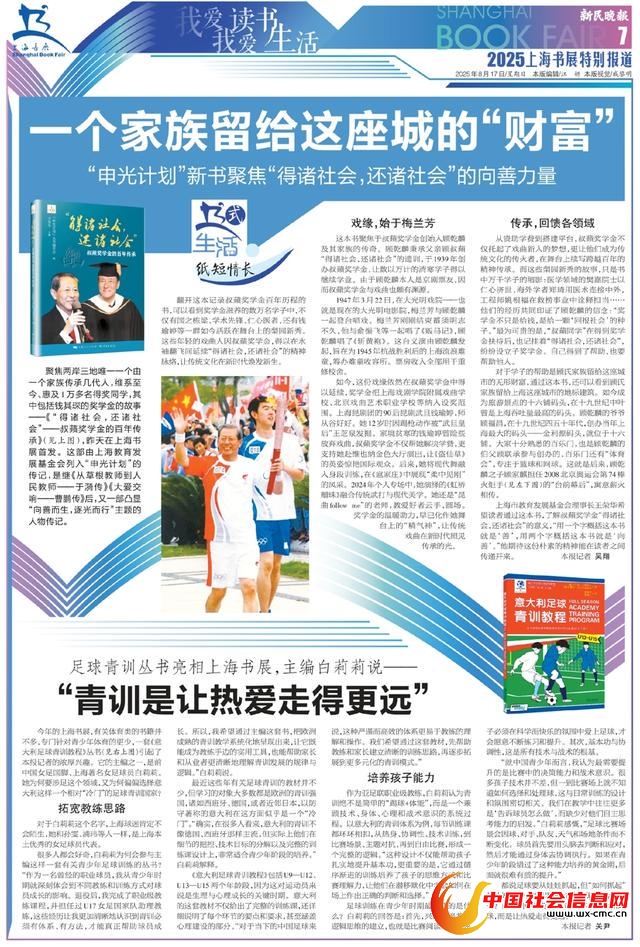 聚焦两岸三地唯一一个由一个家族传承几代人,维系至今、惠及1万多名得奖同学,其中包括钱其琛的奖学金的故事——《“得诸社会,还诸社会”——叔蘋奖学金的百年传承》(见上图),昨天在上海书展首发。这部由上海教育发展基金会列入“申光计划”的传记,是继《从草根教师到人民教师——于漪传》《大爱交响——曹鹏传》后,又一部凸显“向善而生,逐光而行”主题的人物传记。