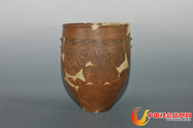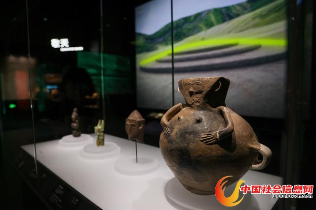 陶器泥塑是此次展出的第二大类文物,总计113件/组。位于显眼位置的一件彩陶筒形罐,汇聚中西亚大陆菱形方格纹、仰韶文化玫瑰花纹及红山文化龙鳞纹,印证了五千年前亚洲东西和中国南北几种古文化在辽西地区的交流融汇。