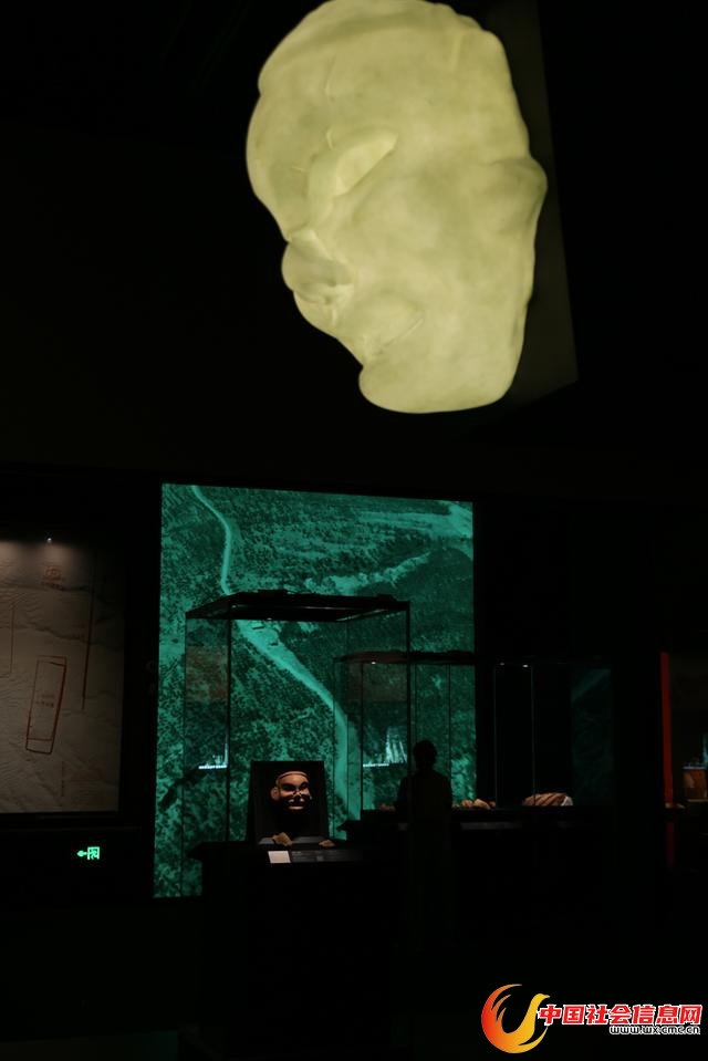 根据现场展示的示意图,牛河梁遗址目前共发现了九座台基。碳—14测年显示,这九座台基是在短时间内集中修建的,著名的女神庙便坐落在第9号台基上。这是中国最早的神庙,因出土红山女神头像而驰名,遗址中发现的大规模群像,为其他遗址所未见。展厅内汇聚了大大小小,形态各异的38件(组)人像类文物,是辽河流域祖先崇拜的实物见证。其中,被苏秉琦称为“红山人的女祖,也是中华民族的‘共祖’”的红山女神头像以复制件形式展出。