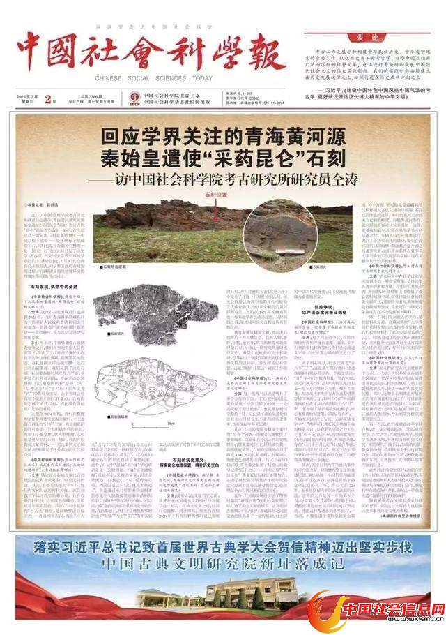今天,《中国社会科学报》头版头条刊发《回应学界关注的青海黄河源 秦始皇遣使“采药昆仑”石刻——访中国社会科学院考古研究所研究员仝涛》。文中,他对学界关注的石刻发现过程、内容解读及自然地理环境的特殊性等问题作回应,并表示:“学术研究中存在争议是学术发展中的一种常见现象,是推动学术进步的重要力量。”