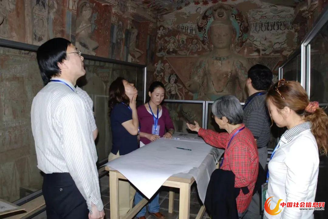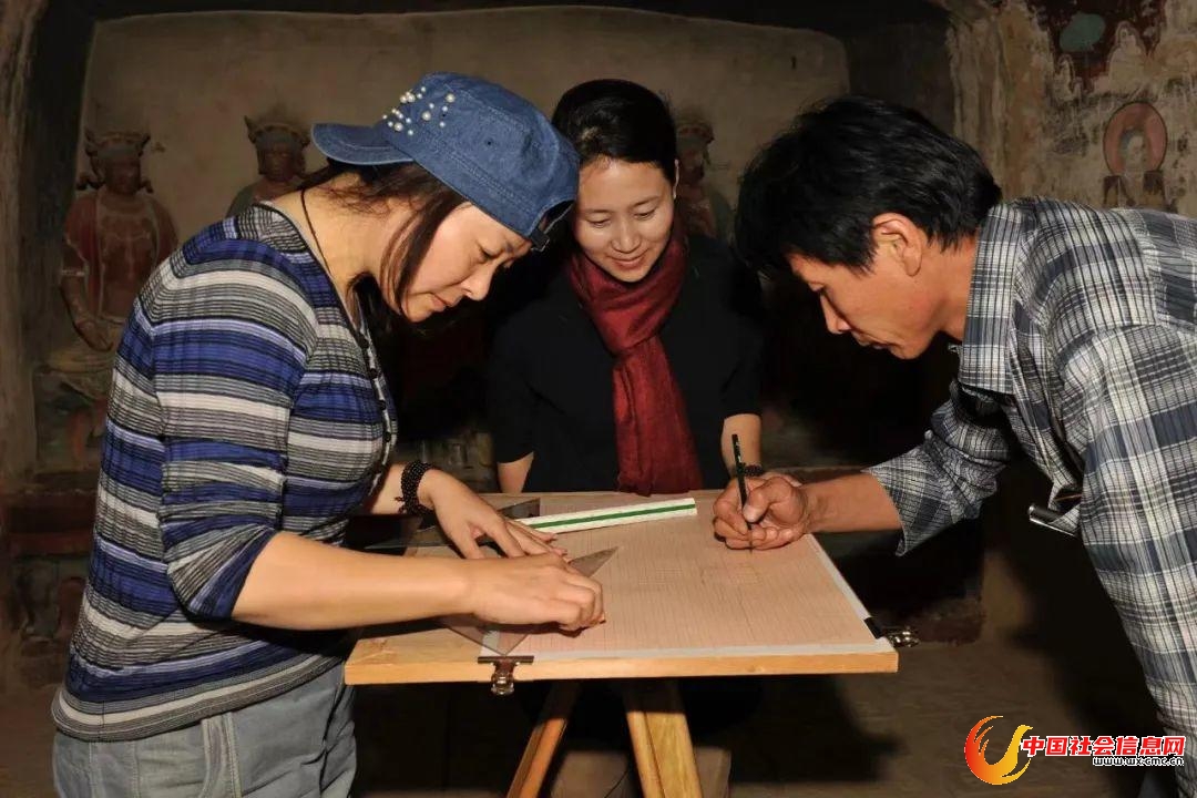 诺日卓玛跟樊锦诗院长和同事一起在洞窟中检查壁画测绘图