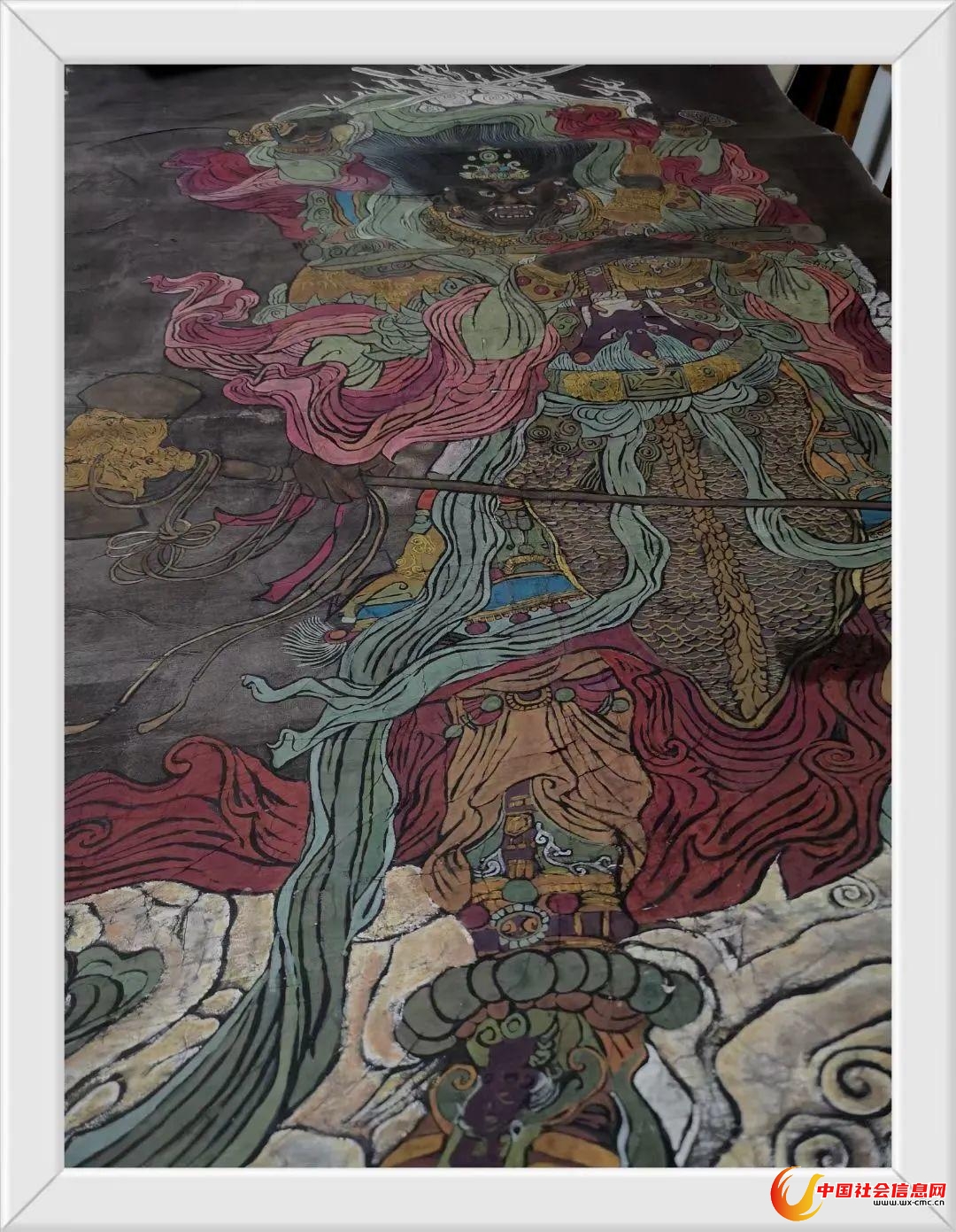 第一天,诺日卓玛主要观察、分析病害、记录,制定修复计划。接着染纸、画心固色、清洗画心的脏污、处理病害、补破、贴折条。画心背面上胶矾水、上墙。第二天全色和接笔,完成修复档案,才算完成。