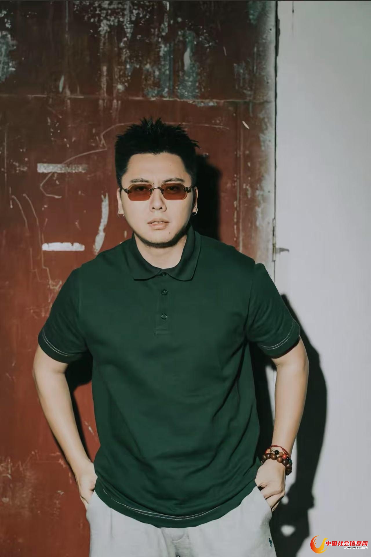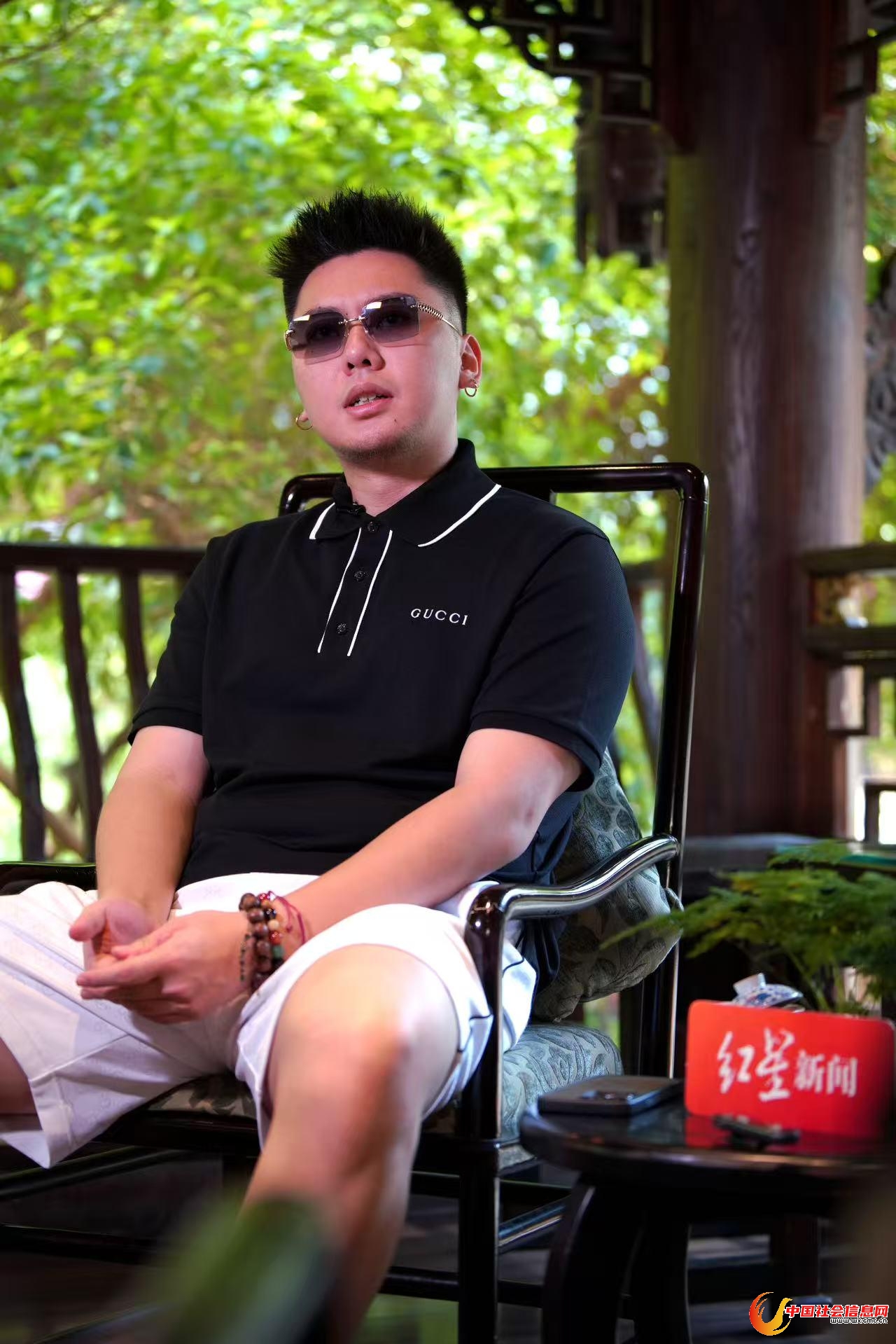 奢侈品牌Polo衫、十八子手串、金色耳环与墨镜,跷着二郎腿的那一刻,现实中的他,才和视频里的那个rapper重叠起来。