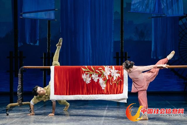 舞剧里,不少舞段和场景前后呼应,激荡出更加澎湃的青春力量。第一幕中,江南女子在温润水乡踏着轻快舞步,轻盈的布匹在她们的手中上下翻飞;“借被子”的舞段妙趣横生,让硝烟弥漫的岁月绽放出温情与美好。随着剧情推进,蓝紫布匹化作血色残片,宣泄着战火纷飞的惊心动魄;那条婚被则被“新媳妇”盖在“通讯员”身上,为他最后送别。“我们用轻喜剧般的灵动舞蹈勾勒出浓浓的军民鱼水情,却在最温柔的瞬间,让观众感受到战争的无情与和平的珍贵。”王舸说。