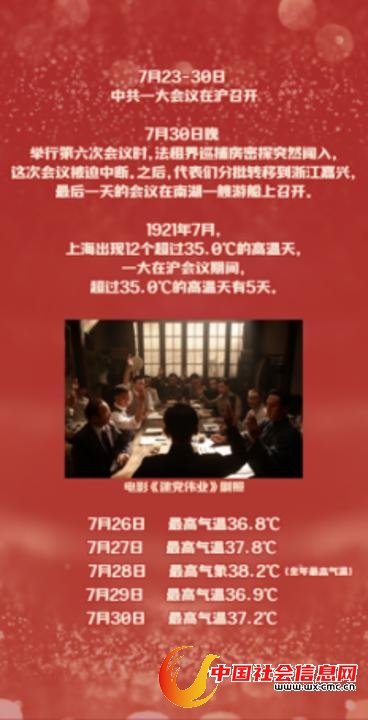 1921年7月23日的最高温和今年7月23日相近。中共一大召开首日,上海多云,最高气温33.1℃,夏风轻轻拂过兴业路上的石库门。从23日至30日,一大在沪会议期间,超过35℃的高温日有5天,其中28日最高温38.2℃,是当年全年的最高气温。