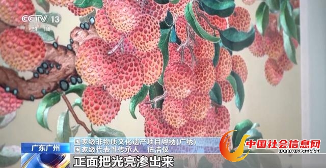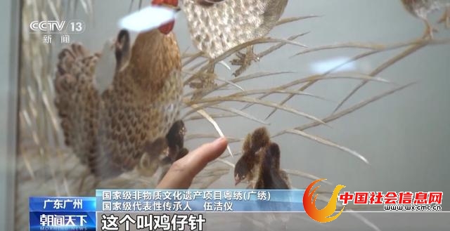 国家级非物质文化遗产项目粤绣(广绣)国家级代表性传承人 伍洁仪:这个叫鸡仔针,因为要凸显每个小鸡都很活泼,把毛做得竖起来了,要一种技巧。还有渗针,正面把光亮渗出来。而且每一个荔枝大小不一致,都是有纹路的。