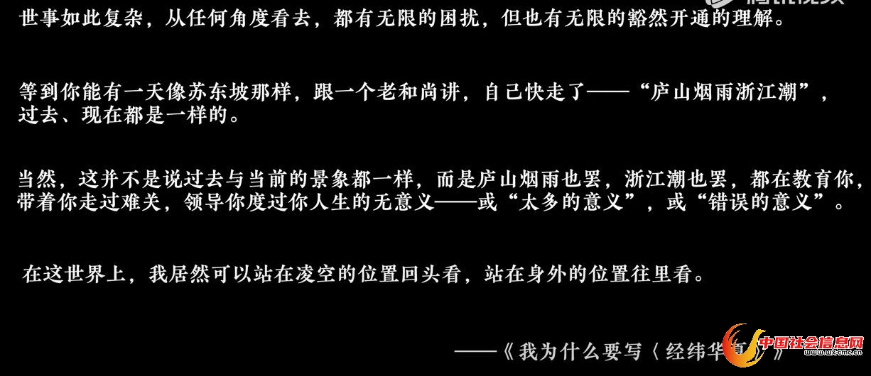 “现在全球性的问题是人找不到目的,找不到人生的意义,于是无所适从。而世界上诱惑太多,今天我们的生活起居里,有很多科技的东西。没有金钱,你不能过日子,没有手机,不能过日子,你必须要处在这种生活中间,你不能独立,得随着大家跑,大家用什么,你跟着用什么。
