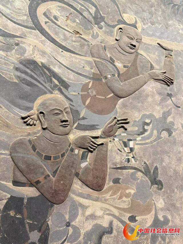 展厅中有一幅临摹的《供养飞天》还原了北周艺术家采用塑、绘相结合的表现形式所绘的麦积山第4窟的飞天作品。“薄肉塑”一说,出自吴作人先生,是一种将雕塑和绘画完美结合,以达到富有立体感的视觉效果的精湛技艺。