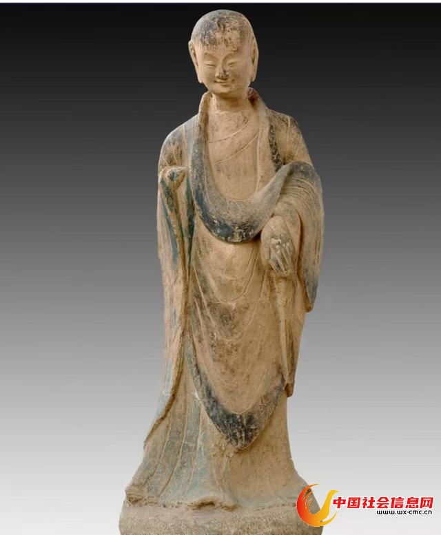 这尊小沙弥身高不足1米,细颈削肩,挺胸鼓腹,身着宽大的袈裟,充分体现了北魏“秀骨清像”的造像风格。他的身体略前倾而立,头稍稍低下,双唇轻闭而嘴角上扬,一双细长凤眼满含天真的笑意,似乎难掩心中的欢欣与喜悦。他的微笑中蕴含着对永恒世界的向往,对知识与真理的渴望,穿越千年,依然打动人心。
