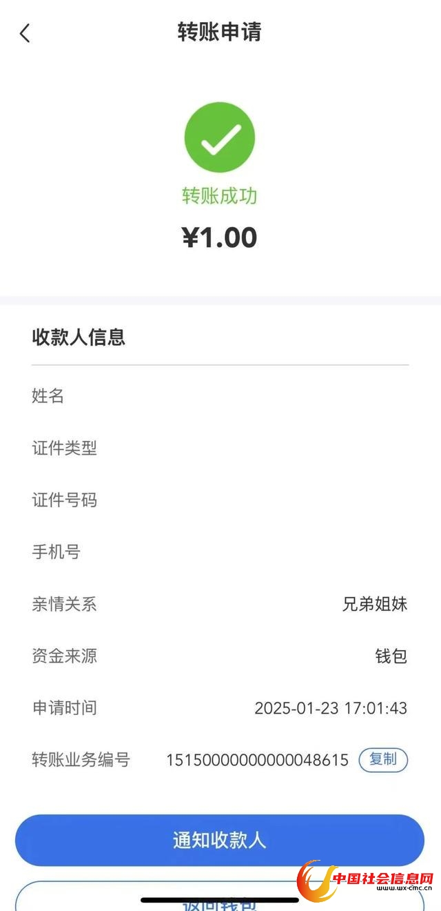 ■在钱包前面界面,点击医保钱包转账申请,填写被转账人基本信息,填写完成之后,点击提交,等待返回信息: