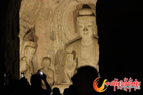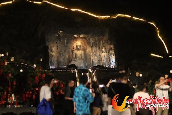 8月19日,河南洛阳,游客在夜色中参观龙门石窟的宾阳洞。中青报·中青网记者 余冰玥/摄