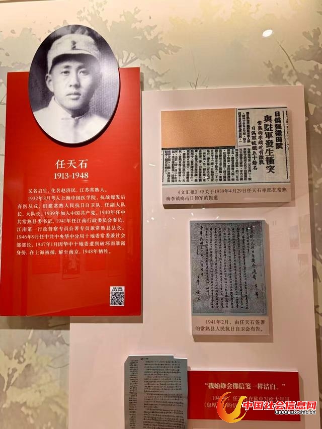 “日伪强征田赋,与驻军发生冲突,常熟梅李镇近有激战日伪军被歼五十余名。”展厅展板上,是1939年4月29日的《文汇报》图片,一篇报道记录了任天石率部在常熟梅李镇痛击日伪军的现场。