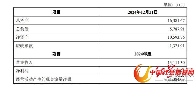 2024年楷码科技实现营收1.31亿元,净利润3318.21万元,经营活动产生的现金流量净额为1384.03万元。截至2024年末,楷码科技资产总额为1.64亿元,净资产为1.06亿元。