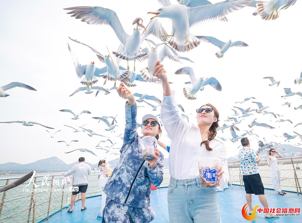 2025年5月22日,在山东省荣成市海驴岛海域,游客们登上游船,尽享夏日休闲时光。湛蓝的天空、和煦的阳光,游船在海雾中激起层层浪花,黑尾鸥与游客亲密互动、嬉戏,形成一幅美丽的生态画卷。李信君摄(人民图片网)