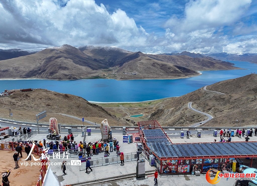 初夏时节,位于西藏山南市的羊卓雍措风景如画,吸引众多游客前来观湖赏景。