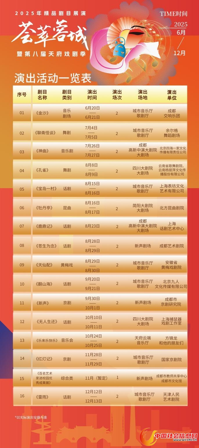 6月20日,红星新闻记者获悉,由成都市文化广电旅游局主办,成都艺术剧院有限责任公司承办的2025年“荟萃蓉城”精品剧目展演暨第八届天府戏剧季启幕,6月至12月,30余场精品剧目将轮番上演。