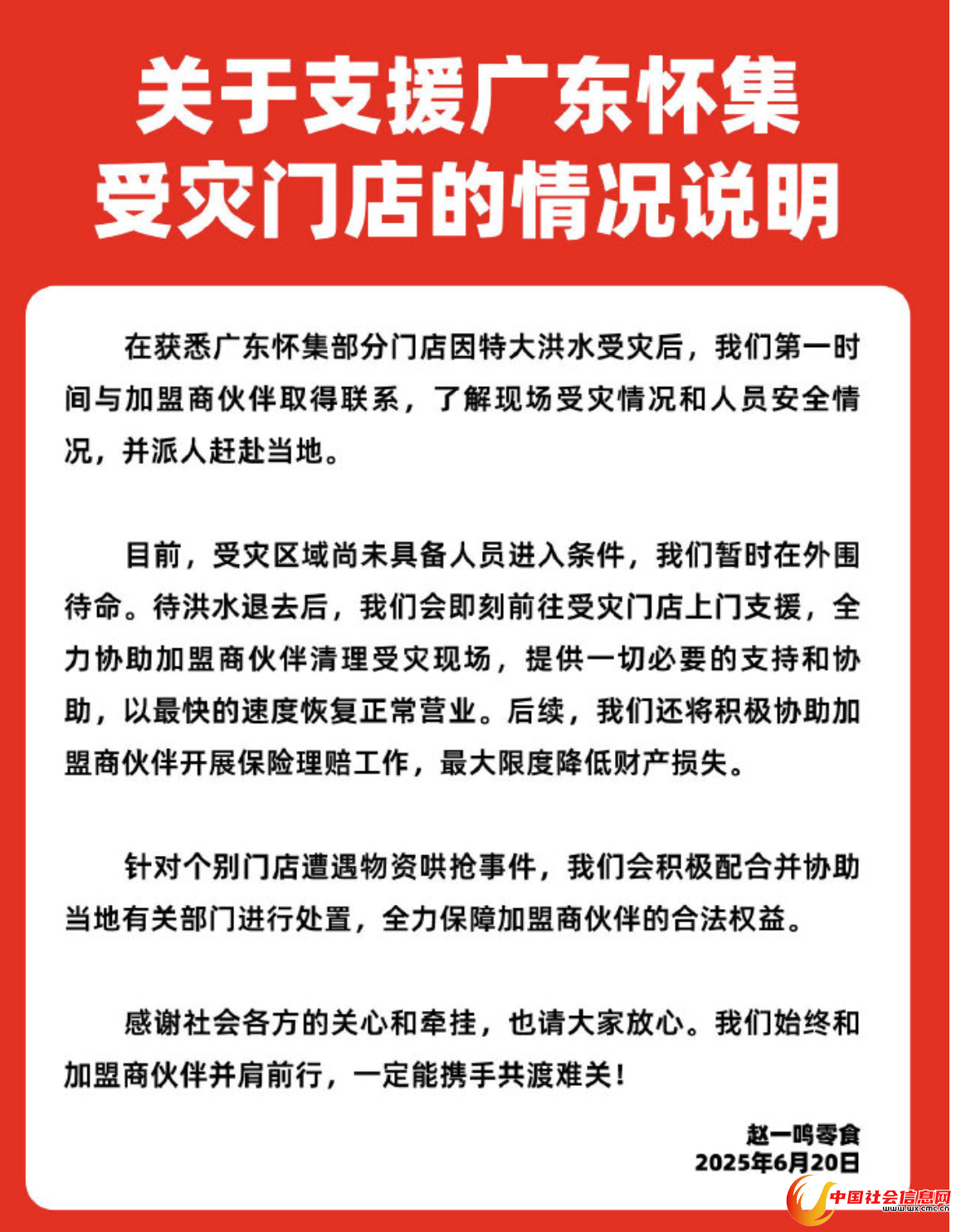 针对该事件,赵一鸣零食今日发布的《关于支援广东怀集受灾门店的情况说明》(下称《情况说明》)称,针对个别门店遭遇物资哄抢事件,会积极配合并协助当地有关部门进行处置,全力保障加盟商伙伴的合法权益。