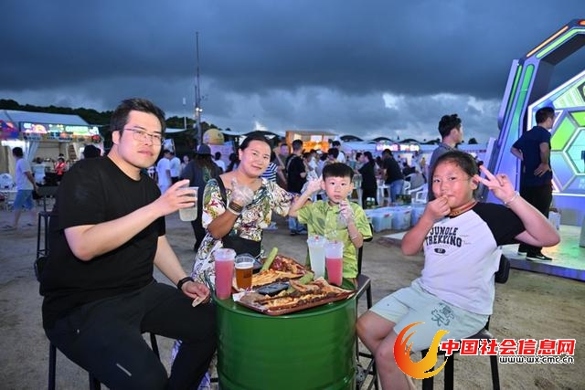 17时30分,夕阳余晖为沙滩镀上金边,海风带着咸湿气息拂面而来。随着音乐声响起,舞台灯光流转闪烁,与海面倒映的斑斓光影交相辉映,啤酒杯上跳动的泡沫折射出欢腾的光晕,现场热闹非凡。
