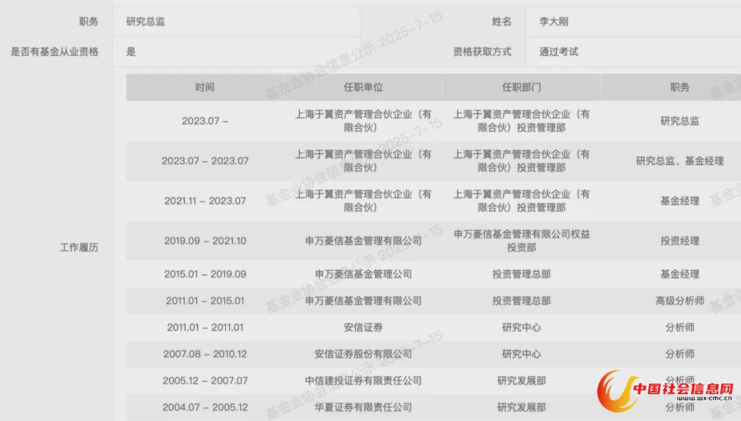 公开资料显示,李大刚拥有复旦大学企业管理硕士学位,2004年起从事金融相关工作,曾任职于中信建投证券研究所、安信证券研究所,担任分析师;2011年1月加入申万菱信基金,曾任行业研究员、节能环保研究组组长等职务,2015年开始担任基金经理,管理公募基金产品,在申万菱信基金工作长达10年时间。2021年11月,李大刚加入于翼资产,担任基金经理,后来成为研究总监。