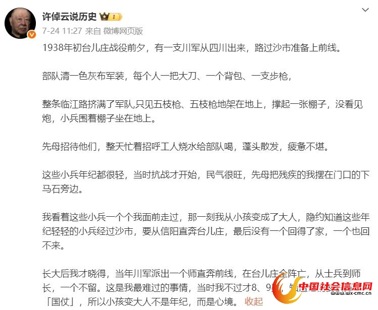 许倬云最后一则动态更新是在7月24日,他和读者分享小时候目睹川军奔赴台儿庄前线的经历,字字都透露出家国情怀: