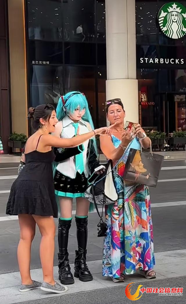 有网友发帖,说自己在南京路步行街邂逅“初音未来”,有几位外国游客也好奇地上前合影。还有一位外国友人兴奋地比出“V”字手势,用生涩的中文称赞:“很酷!这是动画角色吗?”