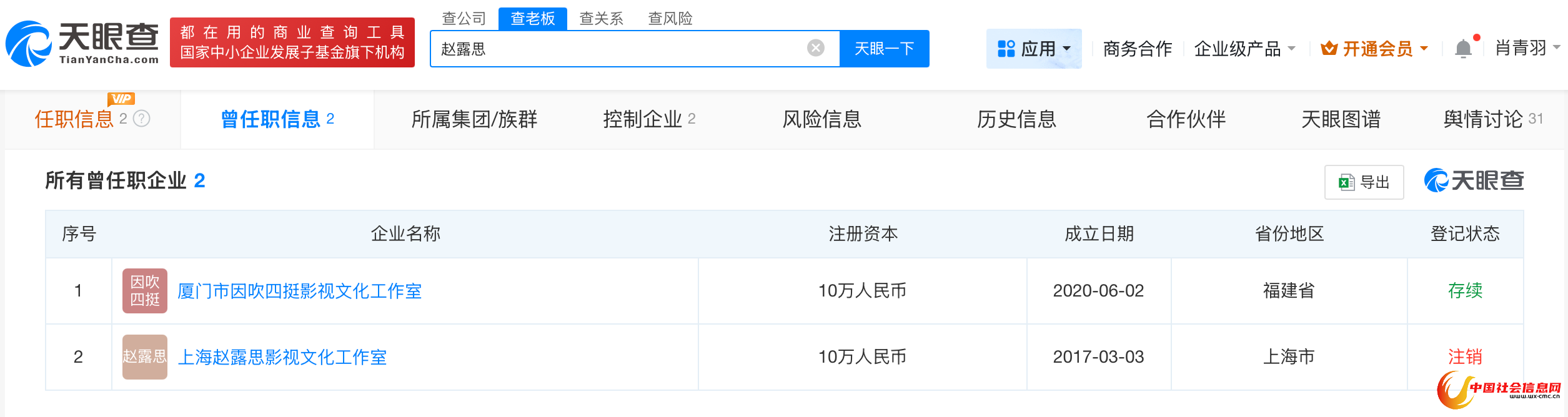 据天眼查显示,赵露思名下关联2家公司,仅厦门市因吹四挺影视文化工作室为存续状态,该工作室成立于2020年6月,为赵露思个人独资企业,出资额10万人民币,经营范围包括电影和影视节目制作、电影和影视节目发行等。
