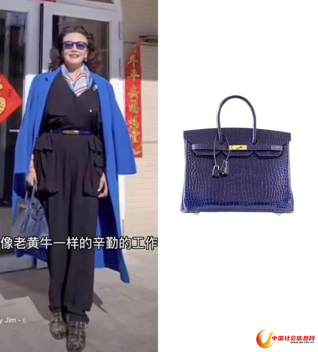 动辄就是紫色鳄鱼铂金包,呼应她的紫墨镜、紫腰带和藏青连体衣,最后用地才蓝提亮,配色十分讲究。