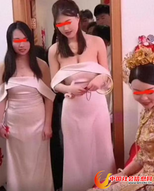 然而其中一位伴娘却不知道怎么想的,也许平日里就是大大咧咧惯了,再或者是想活跃气氛,从新浪带着伴郎团进来迎亲后,就一直任由两侧的肩带滑落在臂弯之间,本来伴娘服塑胸的形状,立马变成了抹胸,同时还在不断下落。
